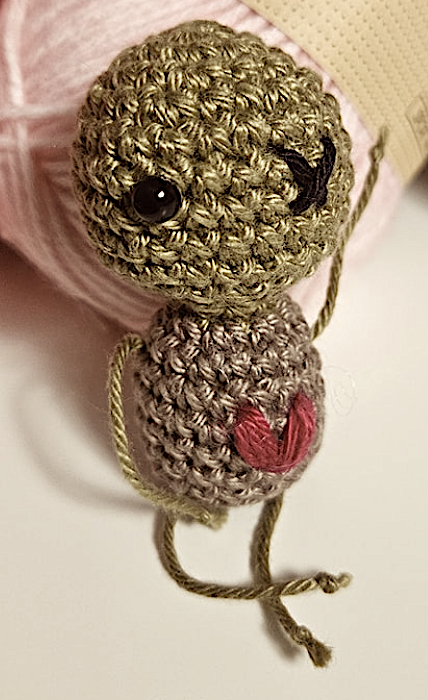 - Petite figure crochetée en fil de coton, composée de deux sphères superposées, brodée de détails noirs et rouges