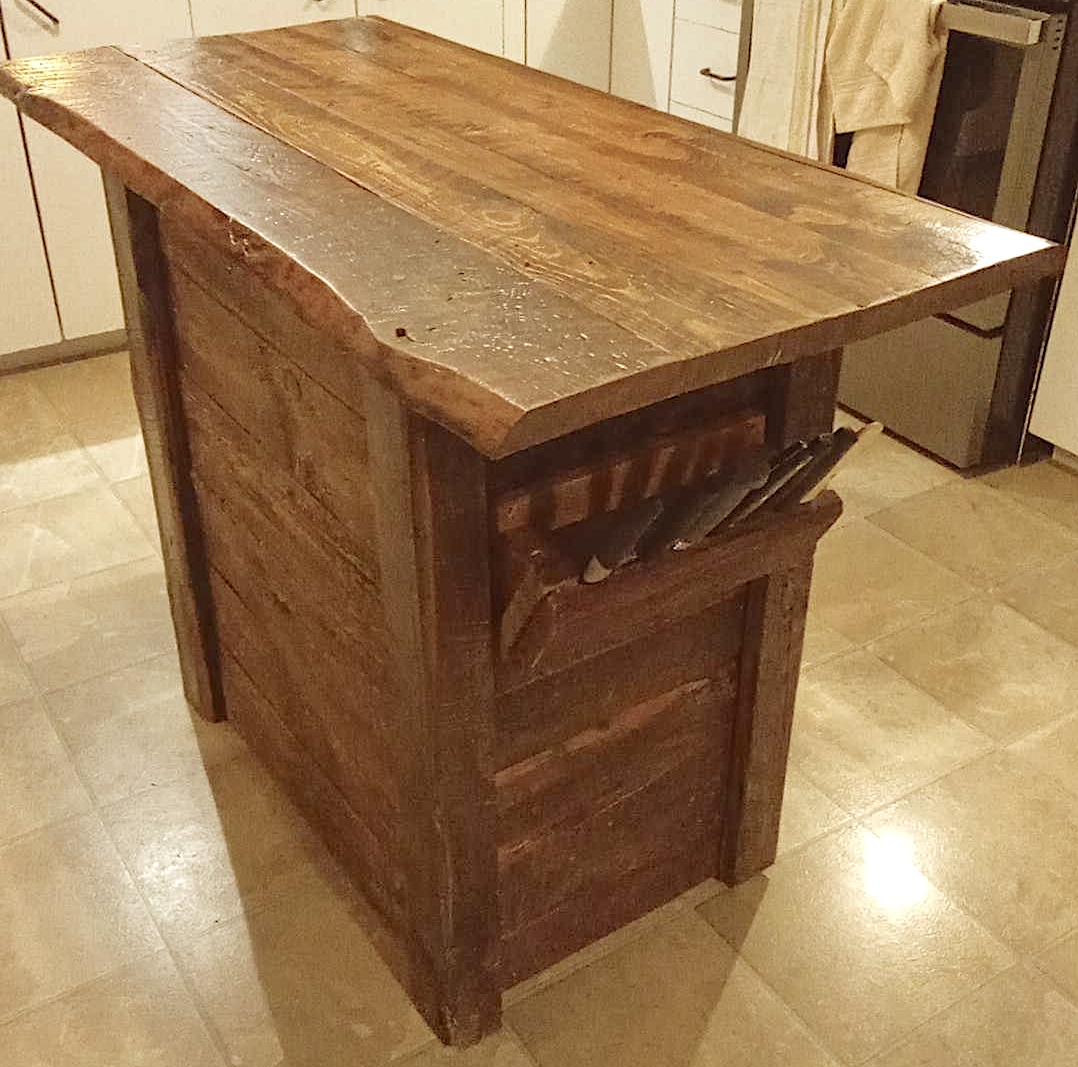 - Îlot de cuisine en bois massif avec porte-couteaux intégré, au fini rustique