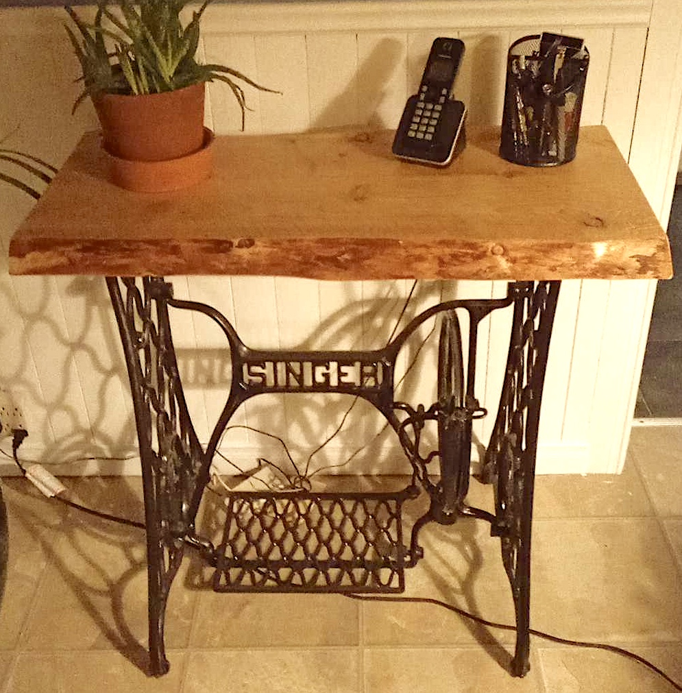 - Table d’appoint fabriquée à partir d’un pied de machine à coudre Singer et d’un plateau en bois brut