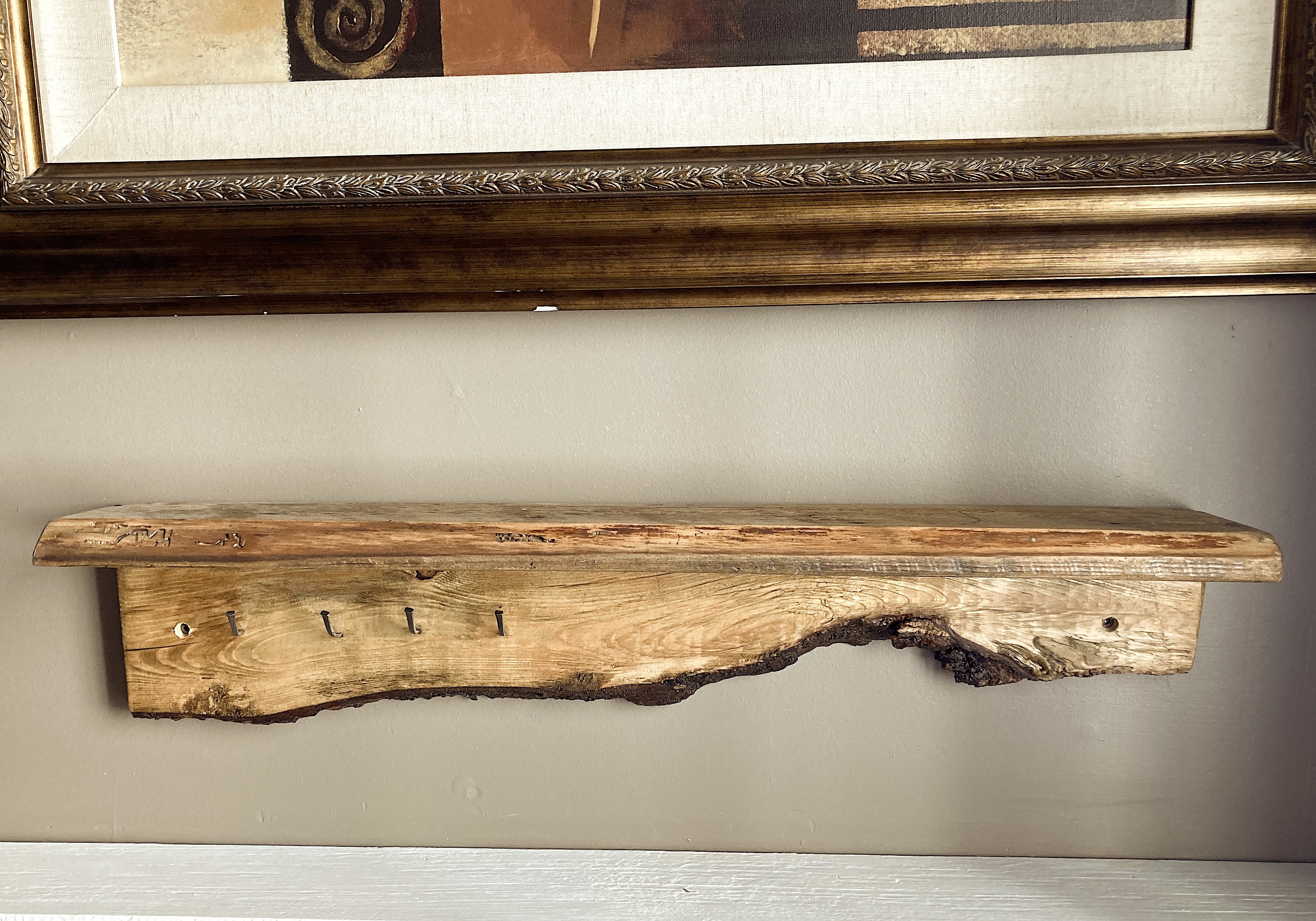 - Étagère murale rustique en bois brut avec crochets intégrés