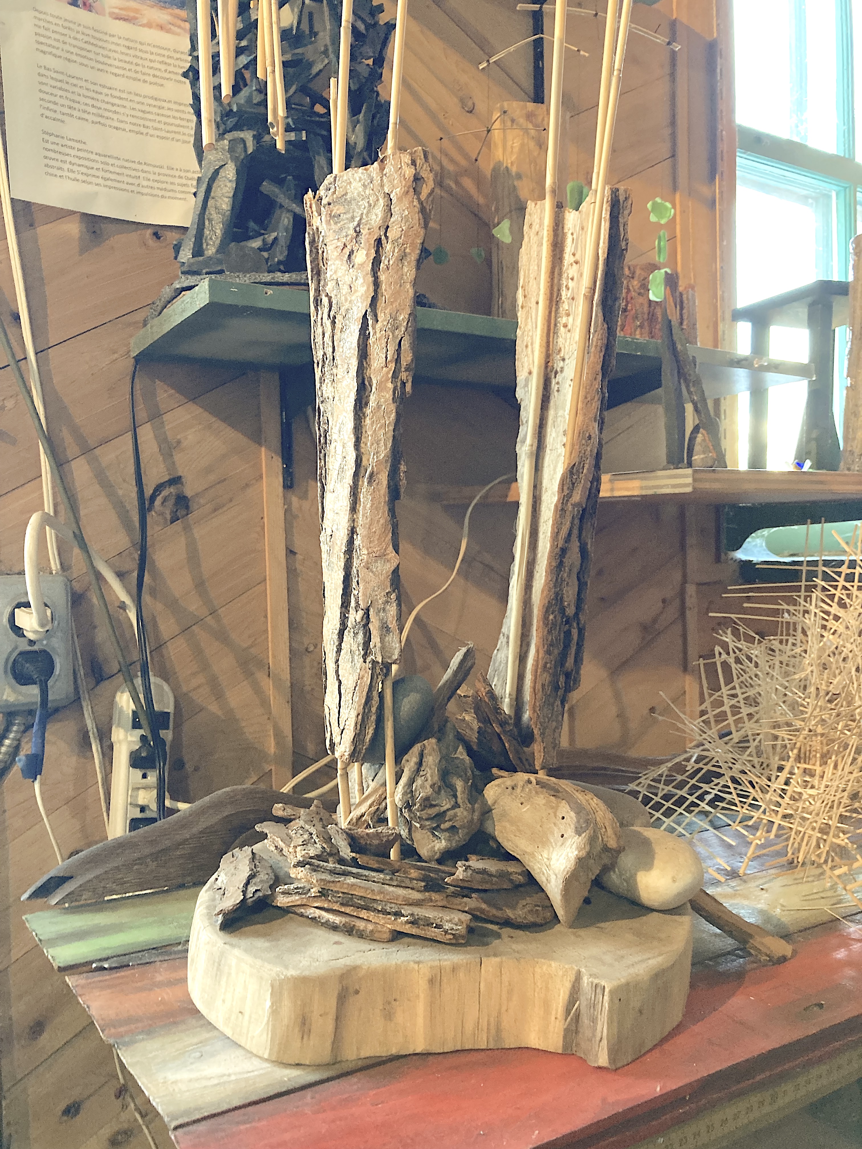 Un aperçu de son savoir-faire : sculptures en bois de mer, assemblages poétiques, collages originaux, poteries artisanales