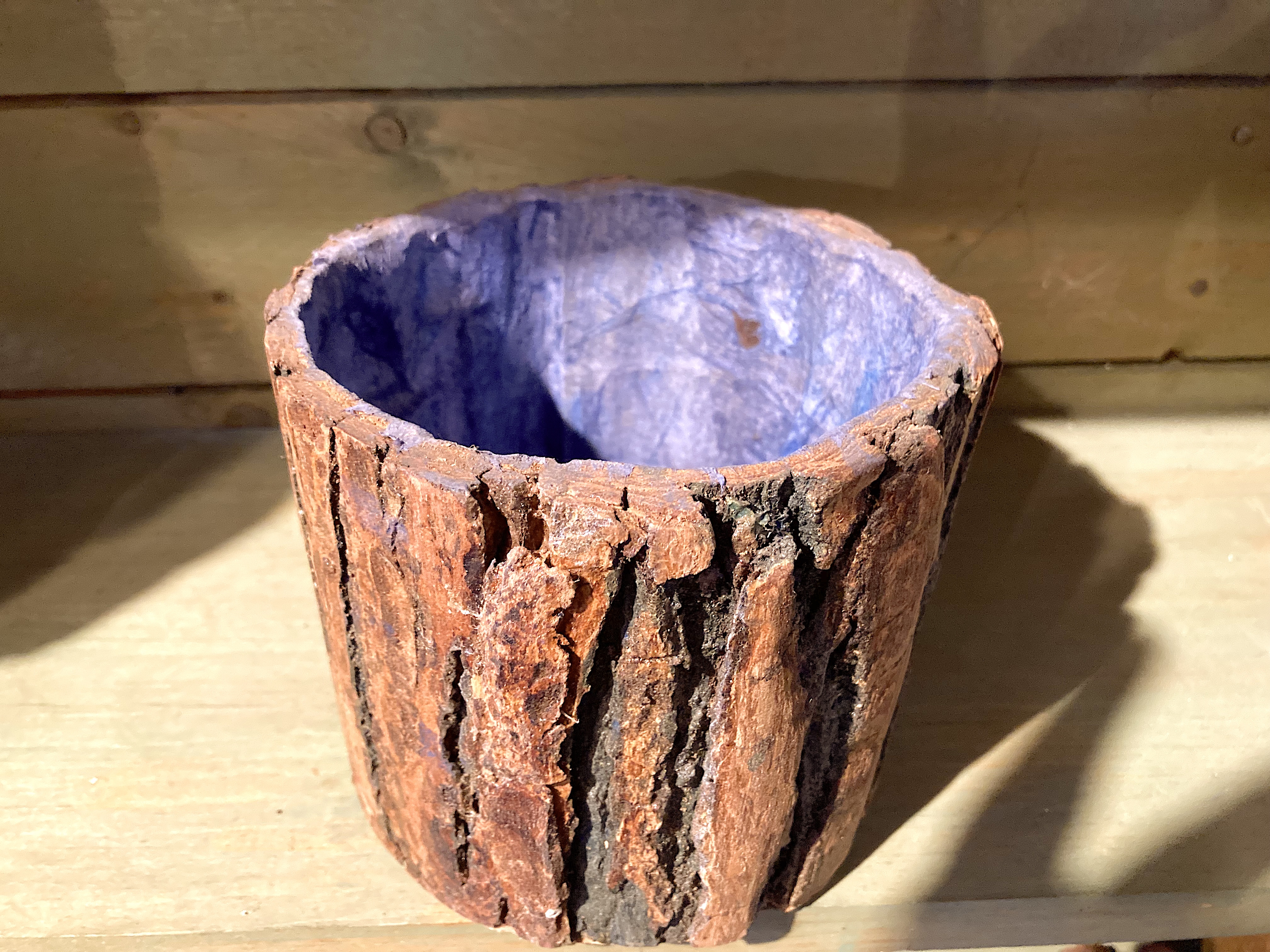 - Récipient cylindrique formé d’écorce naturelle, évidé et peint à l’intérieur d’un pigment violet