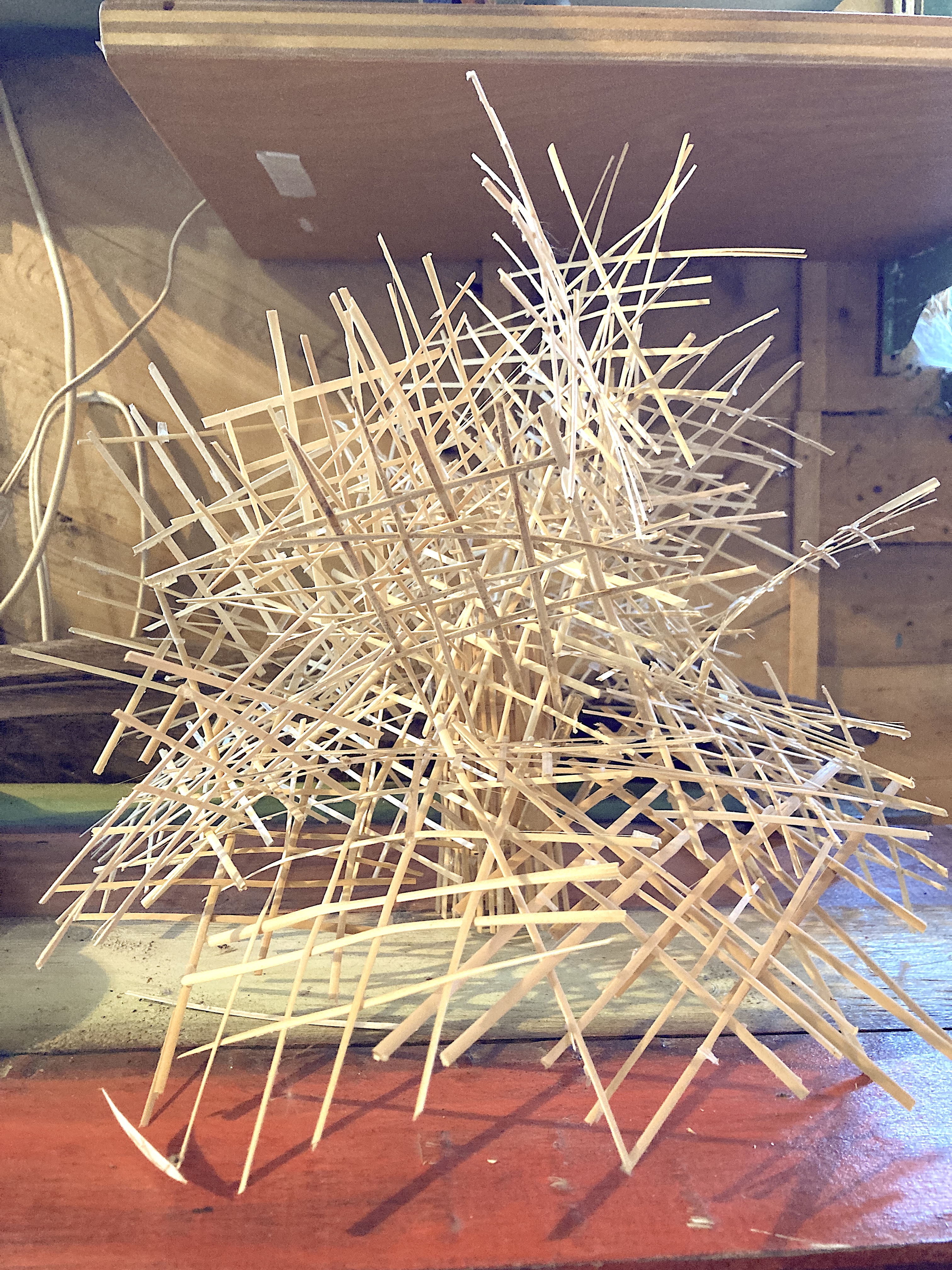 - Structure sculpturale composée d’un réseau complexe de fines baguettes de bois entrecroisées, formant un volume aérien et dynamique
