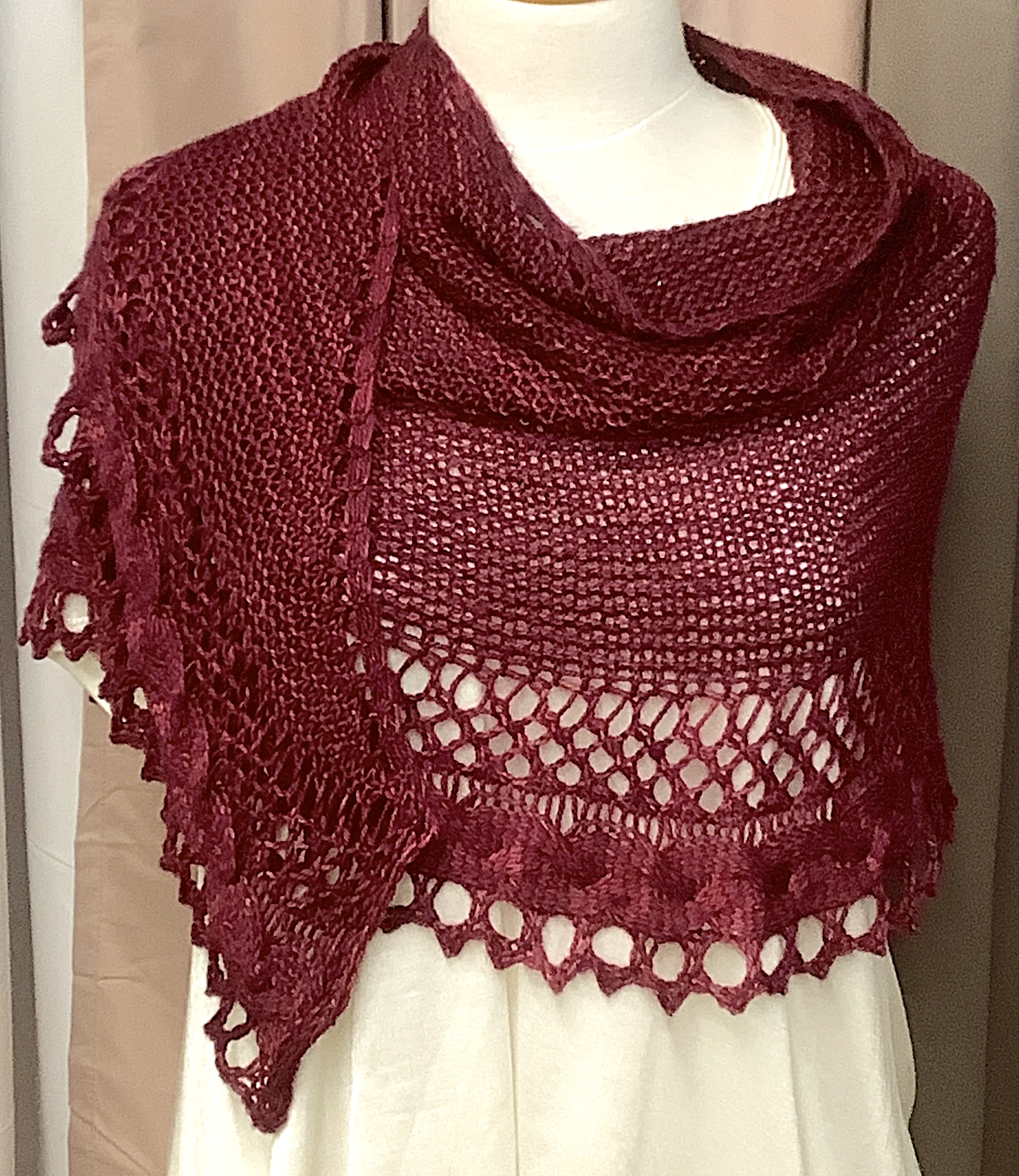 - Châle bordeaux en tricot délicat, rehaussé d’un motif ajouré et d’une bordure travaillée