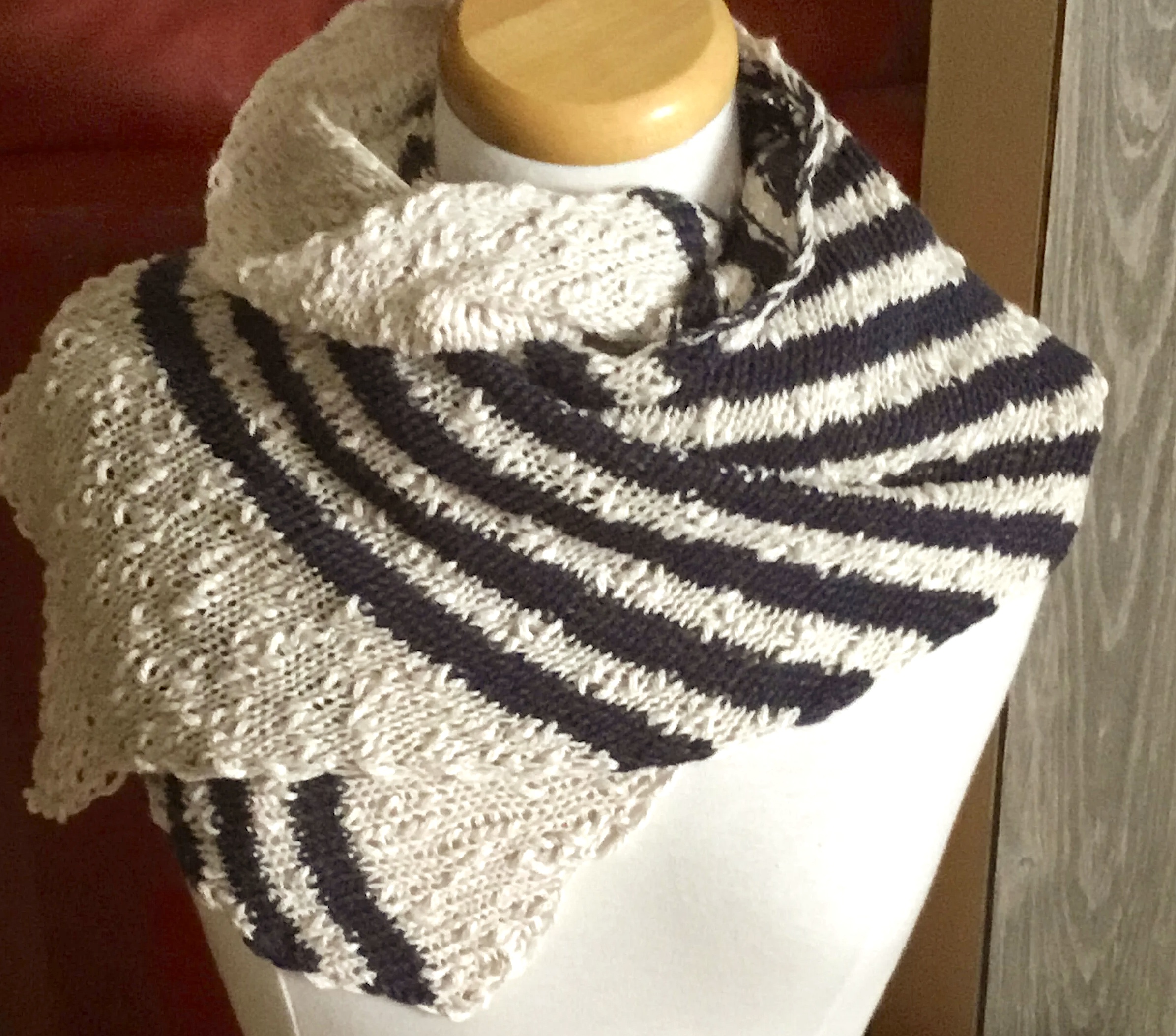 - Châle tricoté en laine naturelle, orné de rayures marines bleu foncé et ivoire