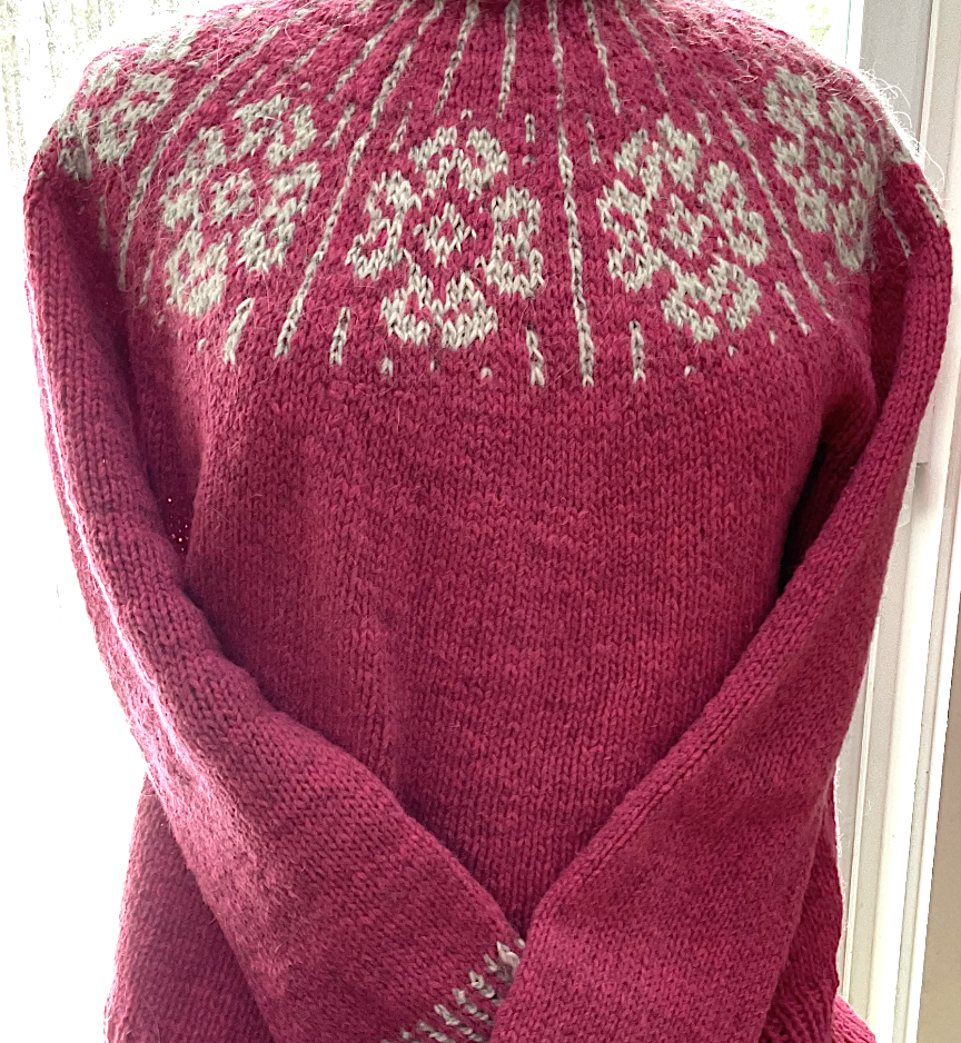 - Chandail tricoté à la main en laine, motif jacquard contrastant au col et aux poignets