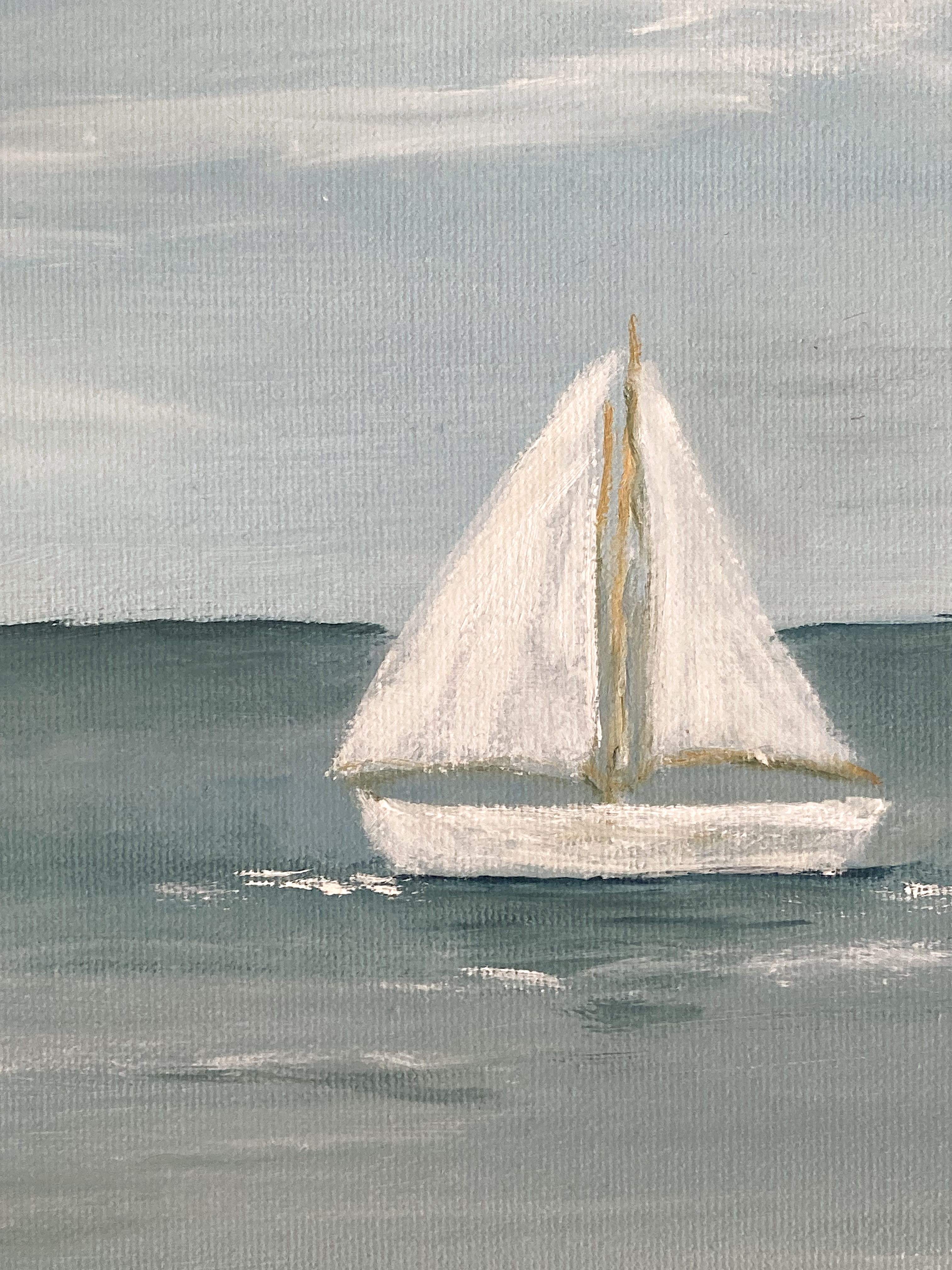 - Peinture à l’huile représentant un voilier solitaire naviguant sur une mer calme sous un ciel pâle
