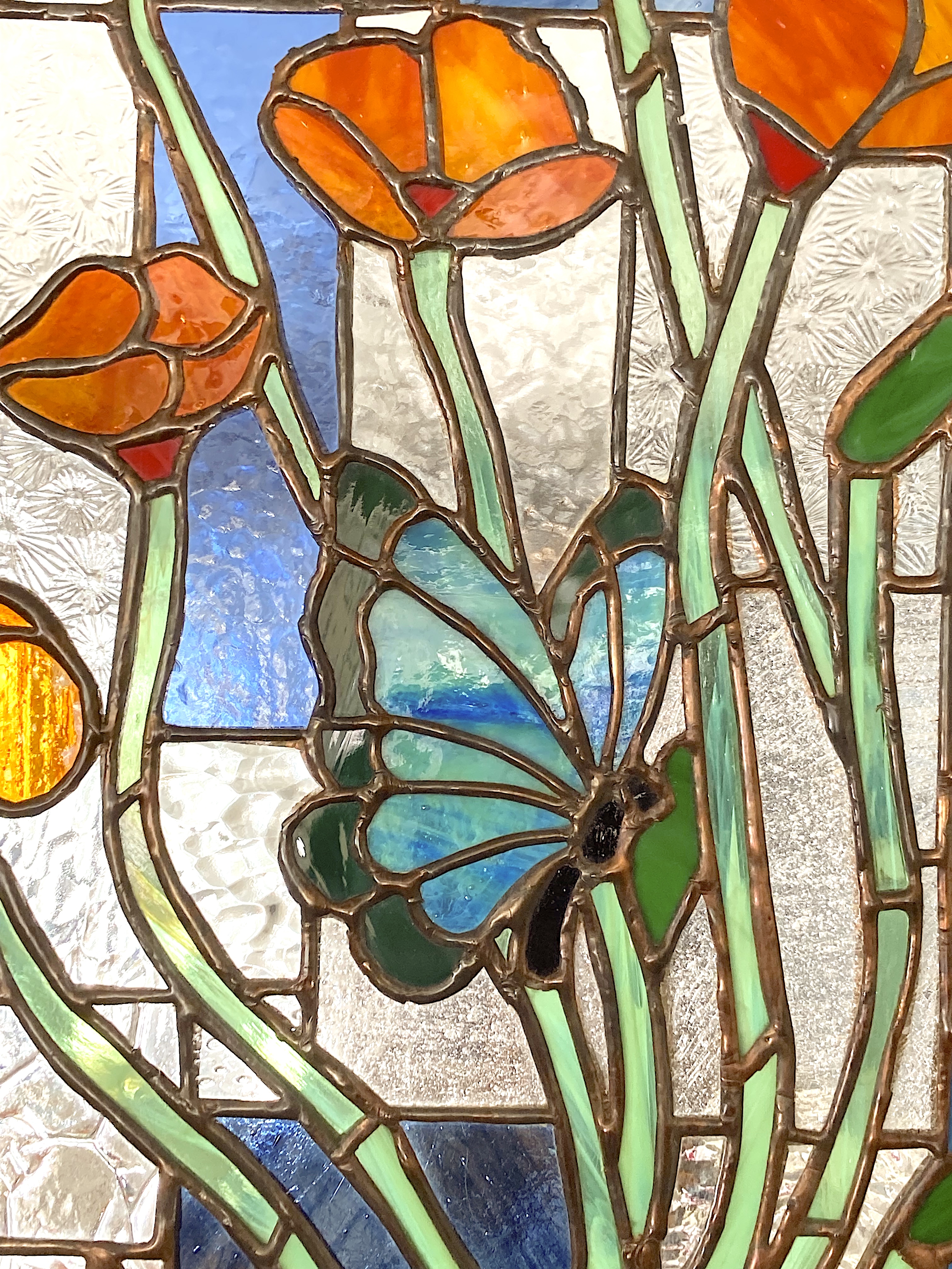 - Vitrail coloré représentant un papillon bleu parmi des fleurs orangées, aux lignes fines et dynamiques