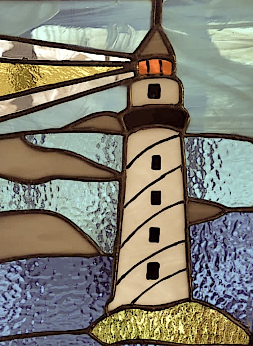 - Vitrail artisanal représentant un phare en bord de mer, aux couleurs vives et texturées