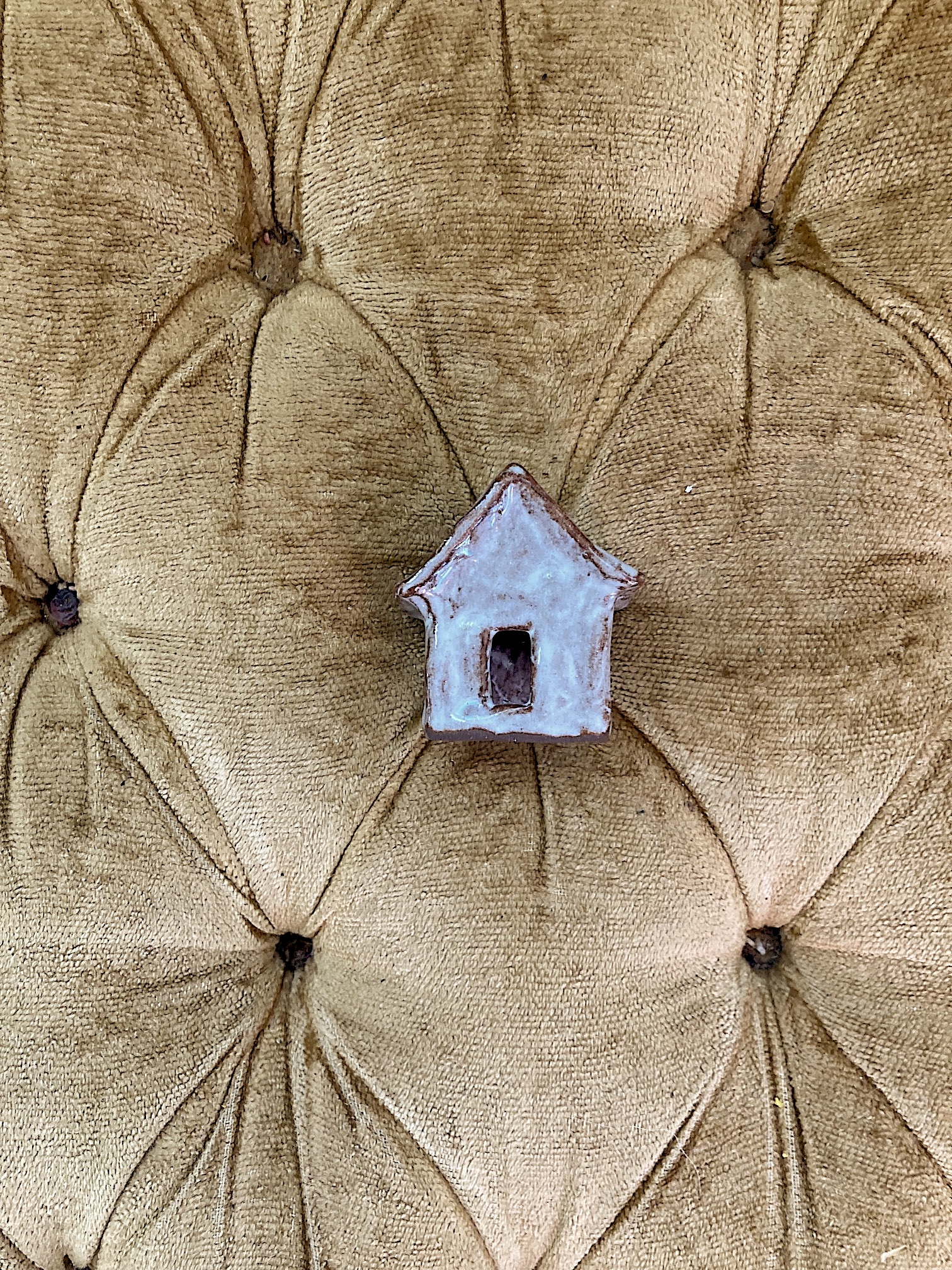 - Petite figurine en céramique en forme de maison, émaillée de blanc.