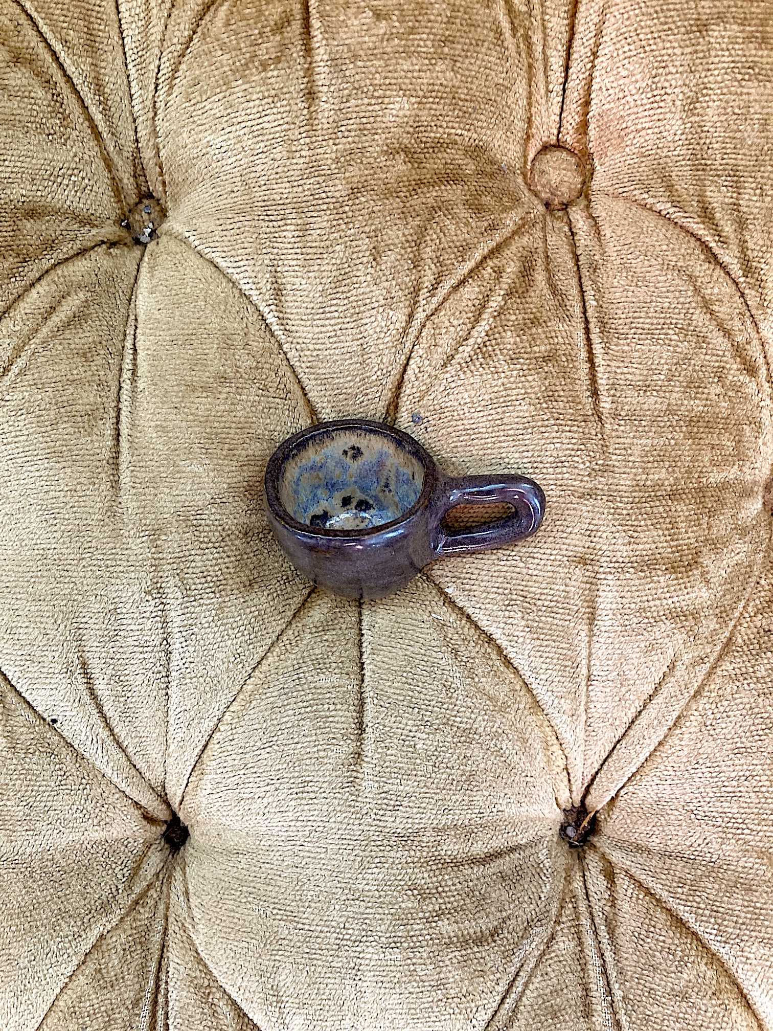 - Tasse miniature en céramique émaillée, de teinte brune et bleutée.